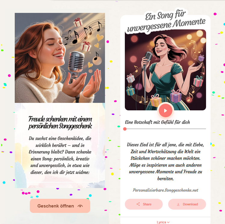 Dann habe ich eine wirklich einzigartige und außergewöhnliche Geschenkidee für Sie: Personalisierte Songs, die nicht nur unter die Haut gehen, sondern auch nachhaltig in Erinnerung bleiben. Solche Lieder schaffen es, tief im Herzen zu berühren und sind perfekt, um besondere Momente unvergesslich zu machen.